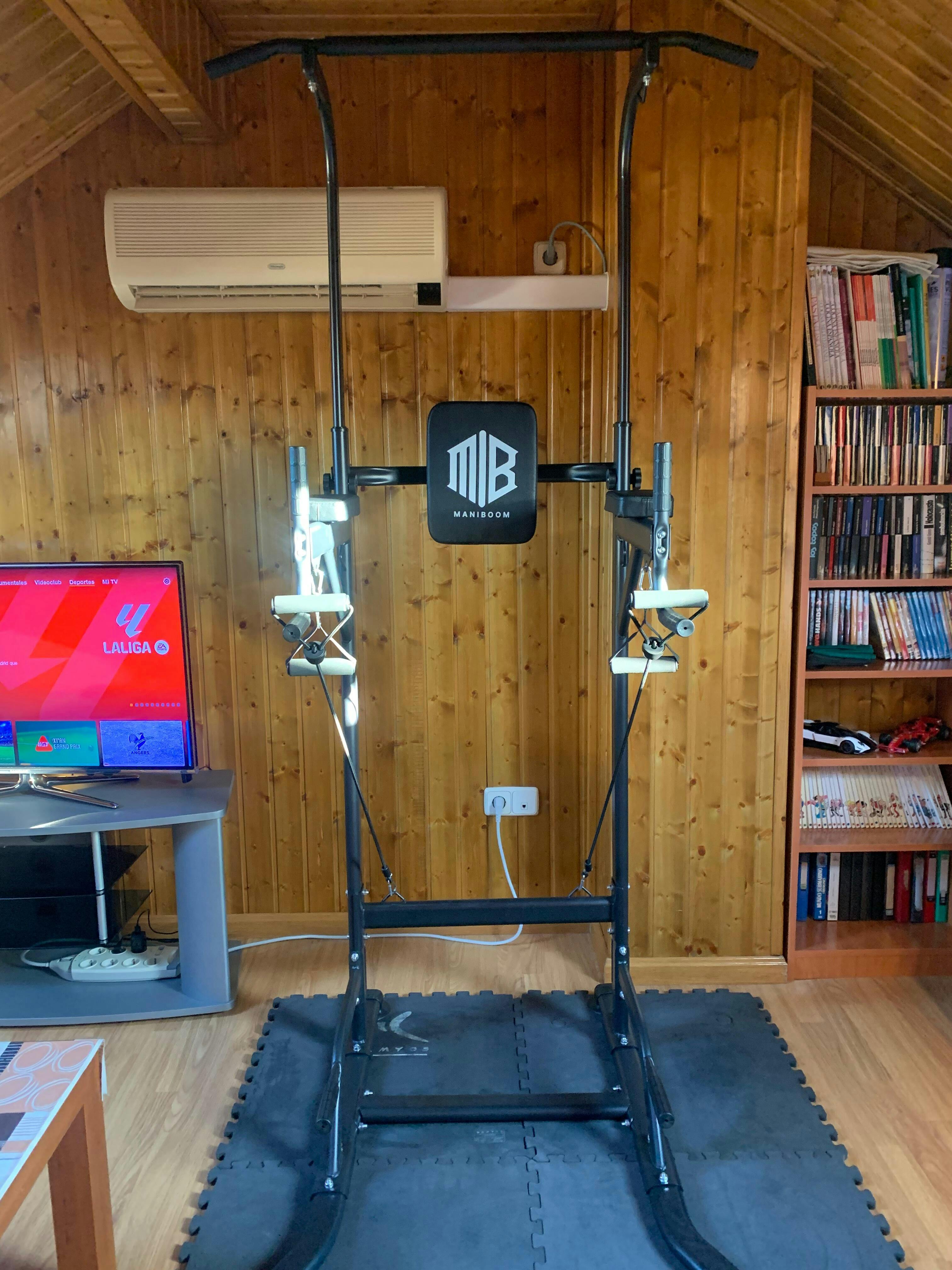 La Máquina de Dominadas Multifuncional ManiBoom es una estación de entrenamiento integral diseñada para fortalecer la musculatura del tren superior y central desde la comodidad de tu hogar. Su estructura robusta y ajustable en altura hasta 2,35 metros la hace adecuada para usuarios de diferentes estaturas y niveles de condición física.